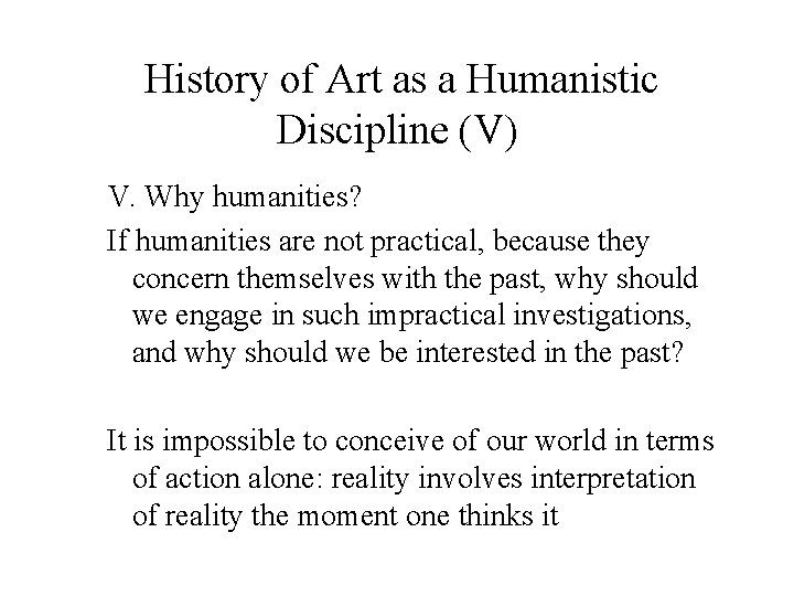 History of Art as a Humanistic Discipline (V) V. Why humanities? If humanities are not practical, because they concern themselves with the past, why should we engage in such impractical investigations, and why should we exist interested in the by? Information technology is impossible to conceive of our world in terms of activity alone: reality involves interpretation of reality the moment one thinks information technology