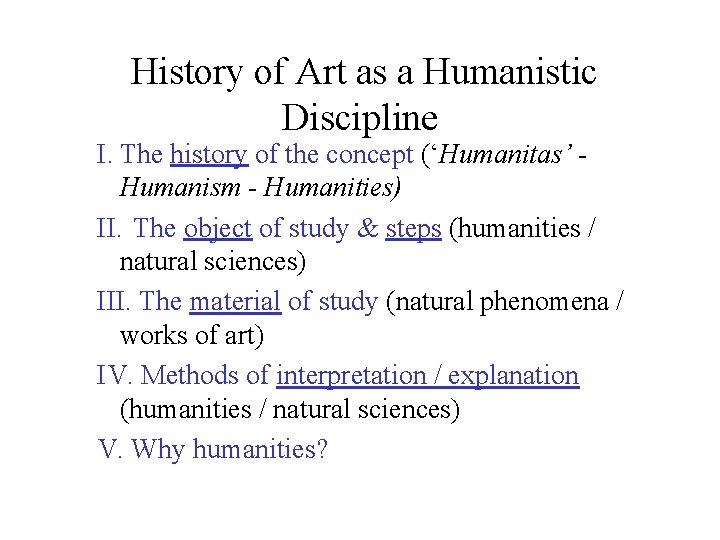 History of Art as a Humanistic Discipline I. The history of the concept ('Humanitas' Humanism - Humanities) Two. The object of study & steps (humanities / natural sciences) 3. The cloth of study (natural phenomena / works of art) IV. Methods of interpretation / explanation (humanities / natural sciences) V. Why humanities?